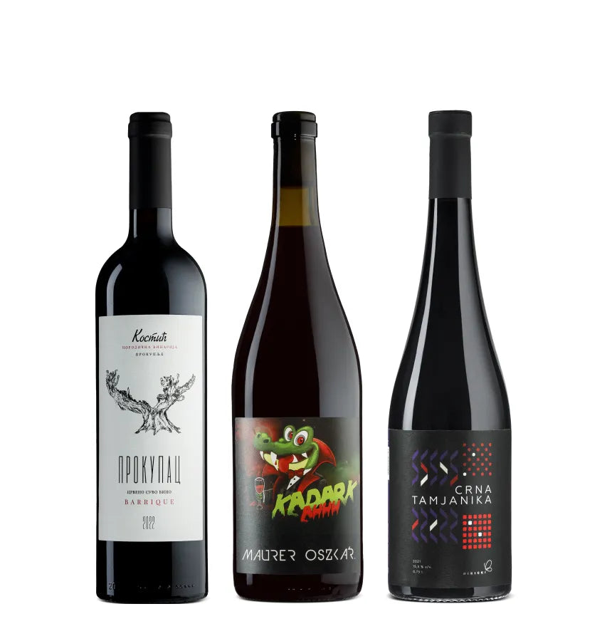 Три сербских красных, которые собрали в одном наборе всю силу, харизму и фирменный балканский вайб. Прокупац даёт благородную пряность, Кадарка — сочность и лёгкость, Црна Тамьяника — глубокие и соблазнительные ароматы. Этот сет хочется подарить тому, кто еще сомневается в местных сербских красных. Локально, ярко, харизматично.